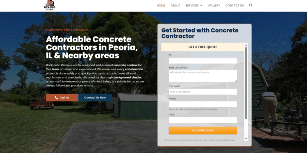 ConcreteContractorPeoria.com is a local website built to connect homeowners and businesses in Peoria, Illinois, with trusted concrete contractors. The goal was simple: create a professional site that shows up on Google, brings in real customer calls, and becomes a valuable digital asset that can be rented by contractors who want more work without chasing leads themselves.